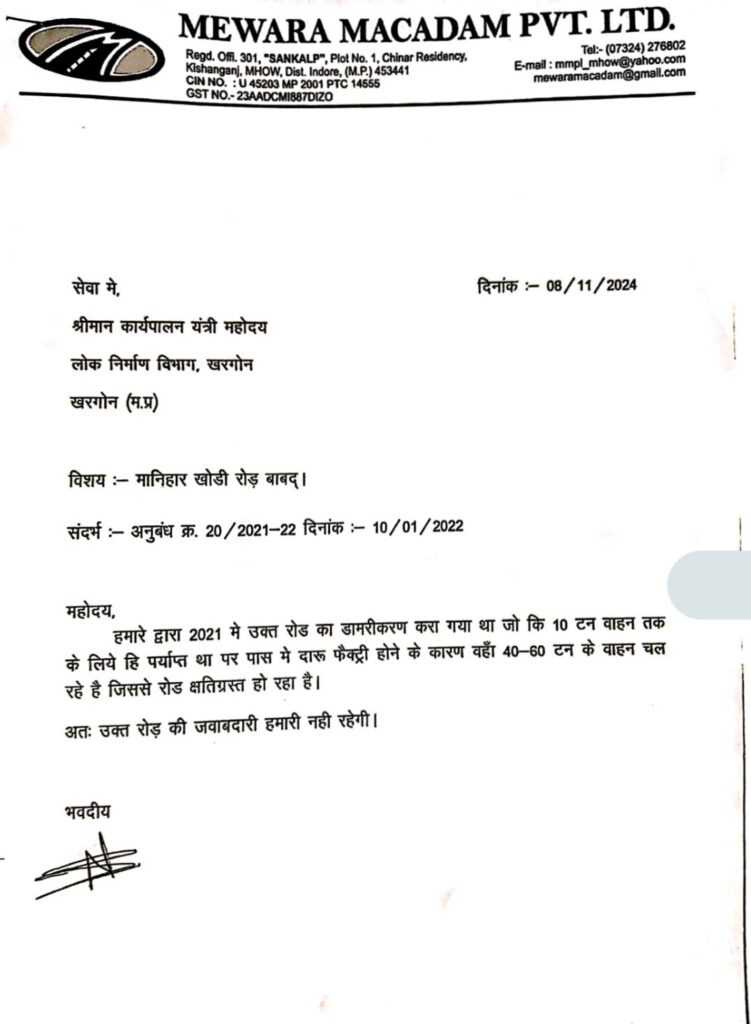 “कंपनी ने स्पष्ट किया है कि मानिहार खोंड़ी रोड का डामरीकरण सिर्फ 10 टन तक के वाहनों के लिए किया गया था, और अब 40-60 टन के भारी वाहनों के कारण सड़क क्षतिग्रस्त हो रही है, जिसकी जिम्मेदारी वह नहीं लेगी।”